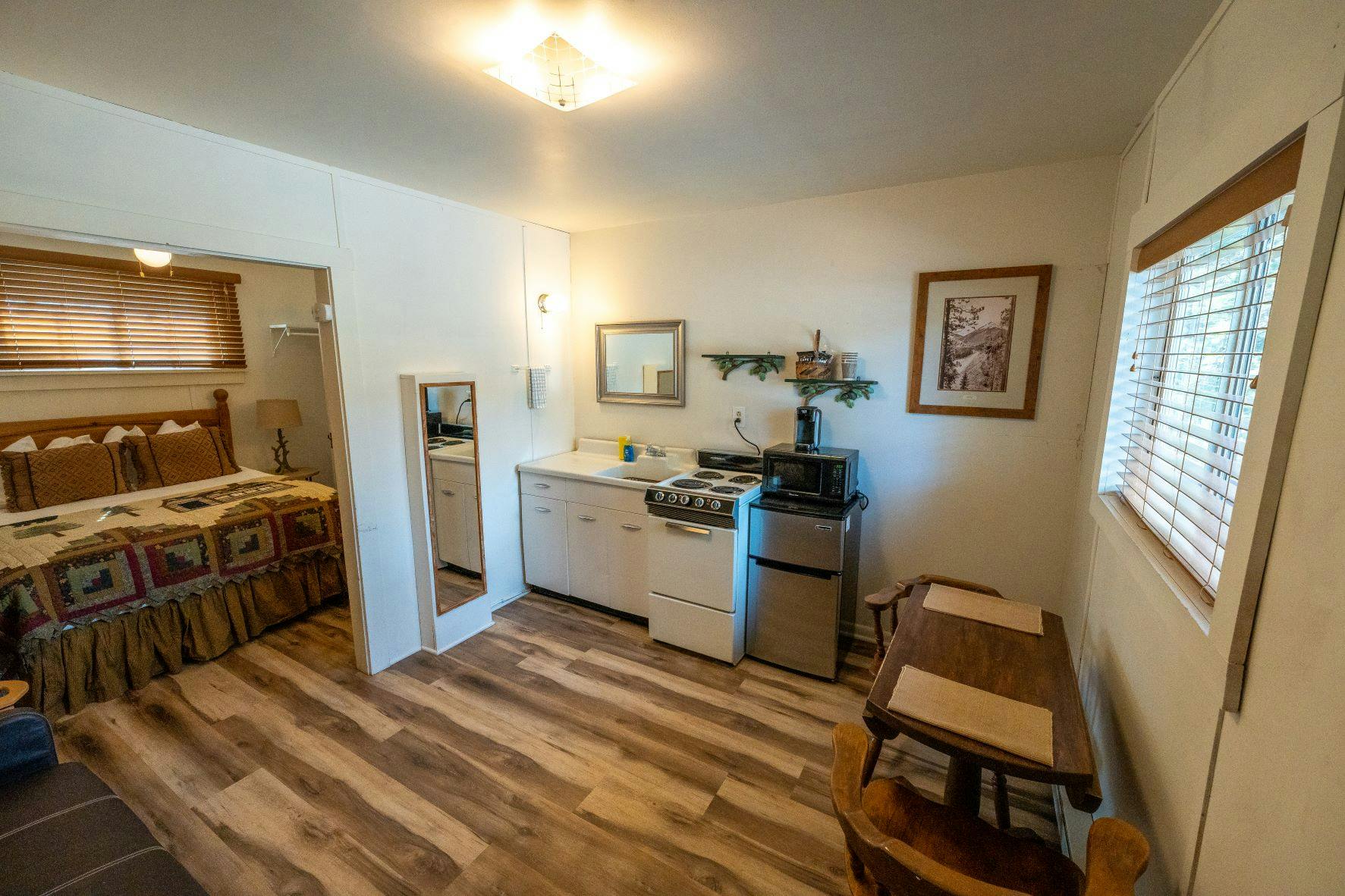 The #4 Economy Room is half of a duplex unit located closely to the riverfront of River Ridge Cottages. It is a one room unit featuring a queen bed, sitting area, shower, bathroom, and full kitchenette. The full kitchenette features a small refrigerator with freezer section, microwave, electric oven & stovetop, and a single serve coffee maker. This unit does NOT have air conditioning. It is only a short walk to the communal deck with Longs Peak views and barbeque available on a first come first served basis. Just below the large communal deck, with stunning Longs Peak views, is 150 feet of riverfront along the Big Thompson River.